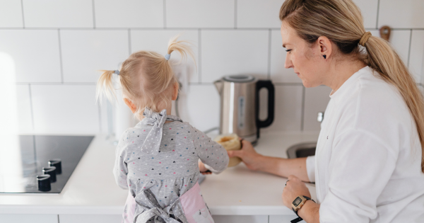 Small children like to “help” Mom or Dad, so allow them to do a few things themselves. For instance, if you’re busy folding the laundry, show them how to do it, and let them pack away a few items, even if you have to fix it later. If you’re baking a cake, let them stir the batter.